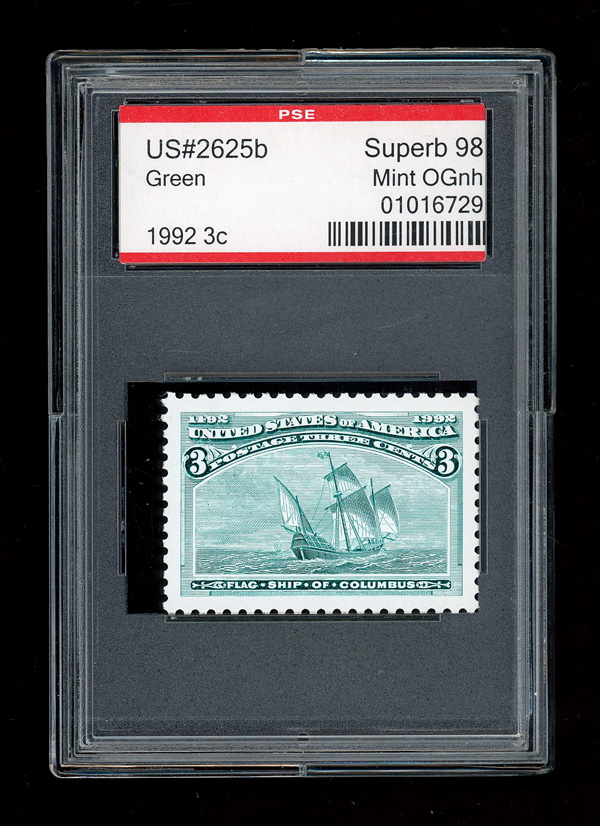 7523 nh 2625b image1992, 3¢ Voyages of Columbus, single from souvenir sheet (Scott 2625b), o.g., never hinged, Superb, with P.S.E. encapsulated certificate graded SUP 98.