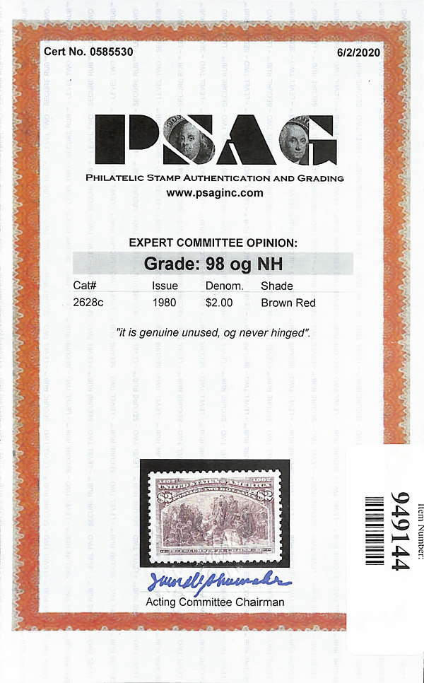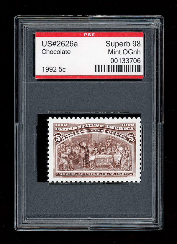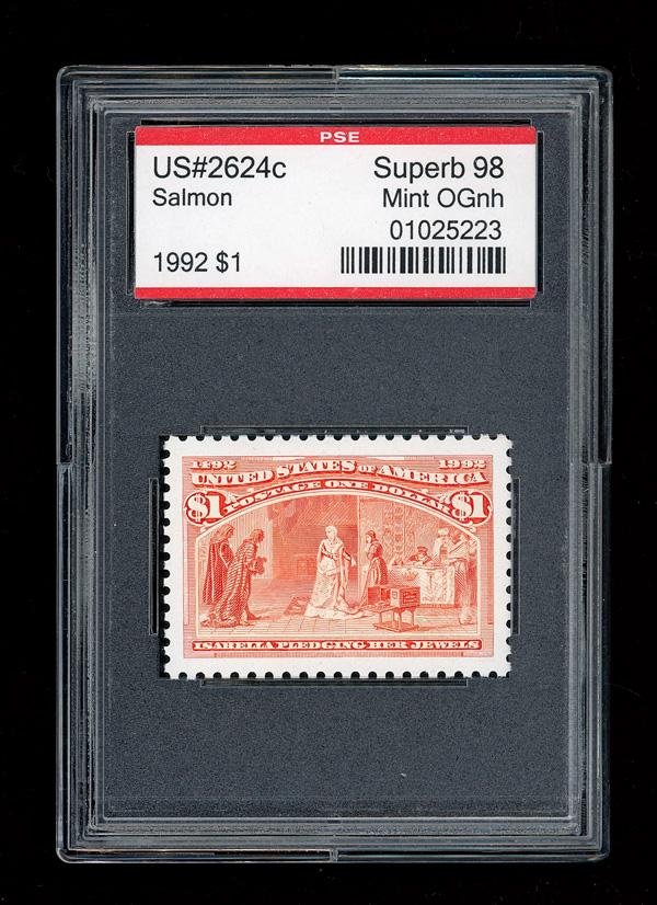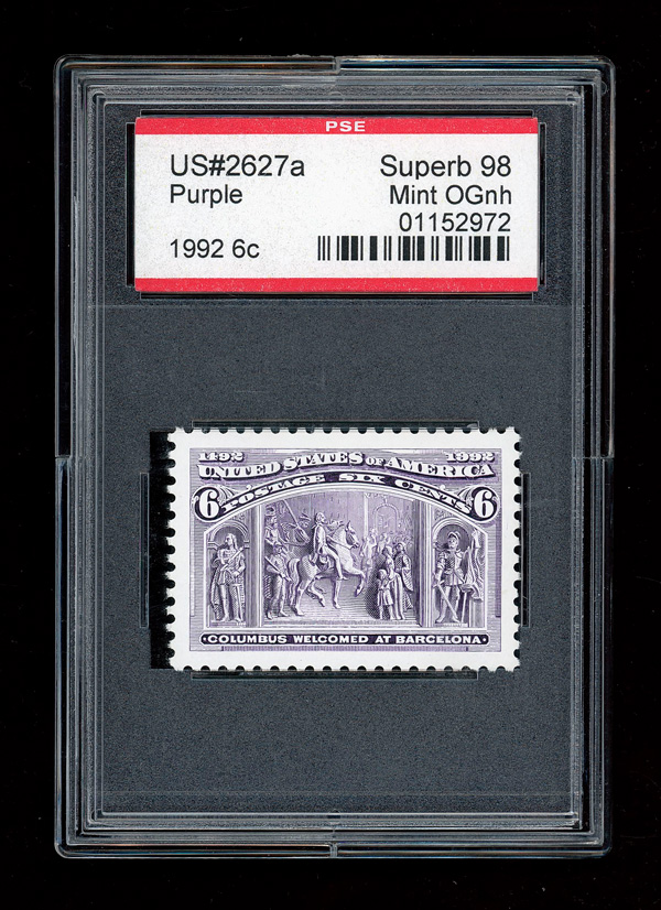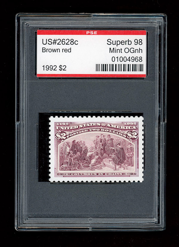 7533 nh 2628c image1992, $2 Voyages of Columbus, single from souvenir sheet (Scott 2628c), o.g., never hinged, Superb no SMQ price, with P.S.E. encapsulated certificate graded SUP 98. (Image) Suggested Bid $100