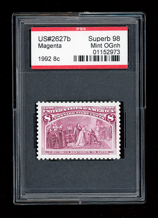 7529 nh 2627b image1992, 8¢ Voyages of Columbus, single from souvenir sheet (Scott 2627b), o.g., never hinged, Superb, with P.S.E. encapsulated certificate graded SUP 98.