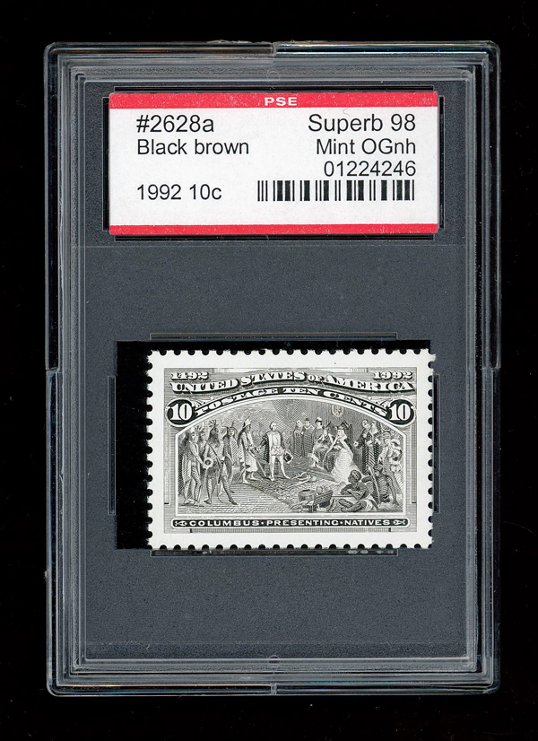 7531 nh 2628a image1992, 10¢ Voyages of Columbus, single from souvenir sheet (Scott 2628a), o.g., never hinged, Superb, with P.S.E. encapsulated certificate graded SUP 98.