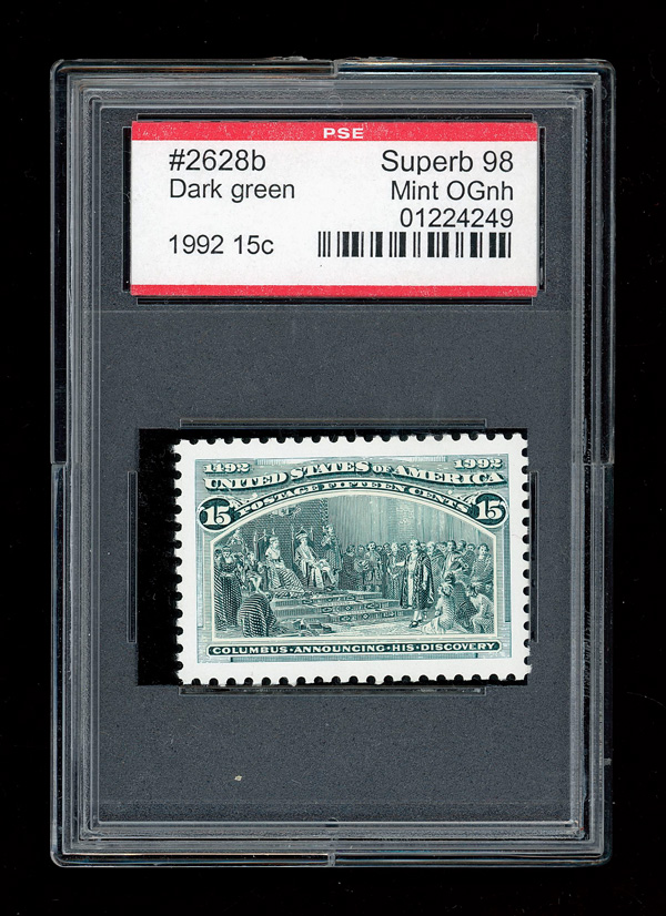 7532 nh 2628b image1992, 15¢ Voyages of Columbus, single from souvenir sheet (Scott 2628b), o.g., never hinged, Superb, with P.S.E. encapsulated certificate graded SUP 98.