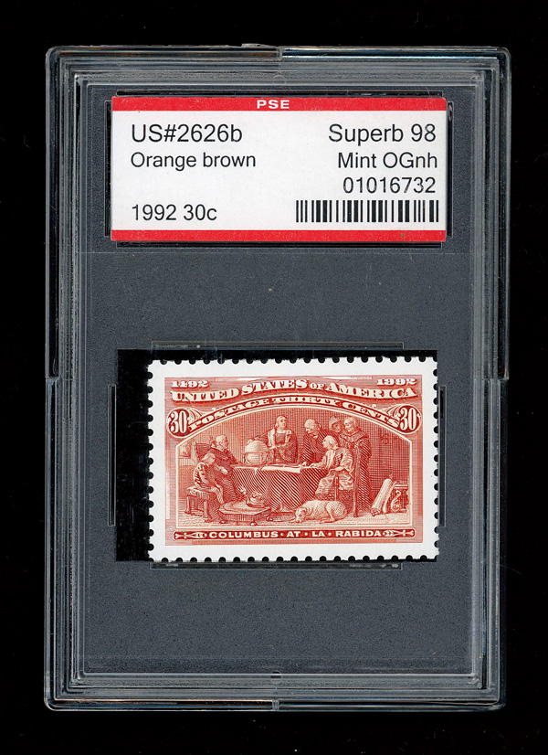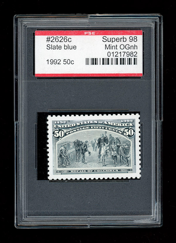 7527 nh 2626c image1992, 50¢ Voyages of Columbus, single from souvenir sheet (Scott 2626c), o.g., never hinged, Superb, with P.S.E. encapsulated certificate graded SUP 98.