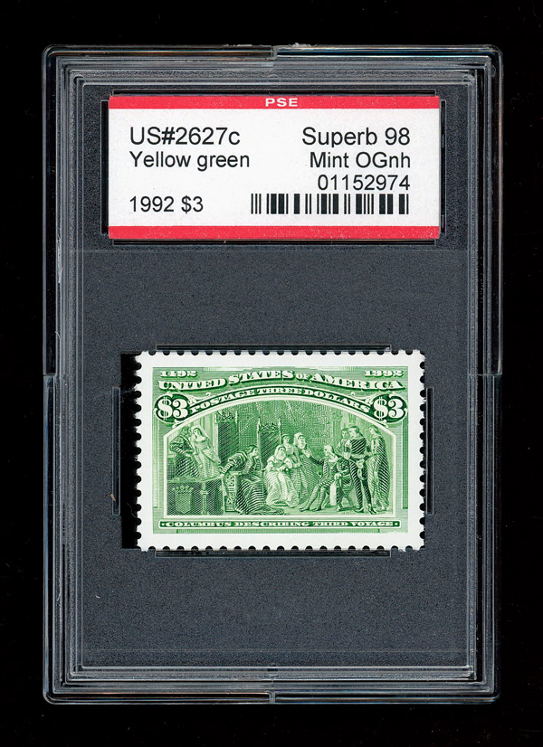 7530 nh 2627c image1992, $3 Voyages of Columbus, single from souvenir sheet (Scott 2627c), o.g., never hinged, Superb, with P.S.E. encapsulated certificate graded SUP 98.