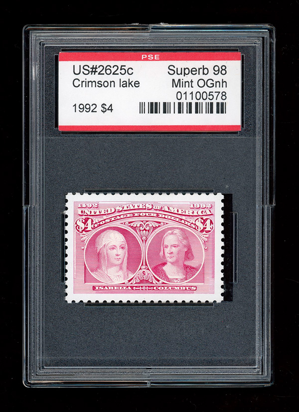 7524 nh 2625c image1992, $4 Voyages of Columbus, single from souvenir sheet (Scott 2625c), o.g., never hinged, Superb, with P.S.E. encapsulated certificate graded SUP 98.