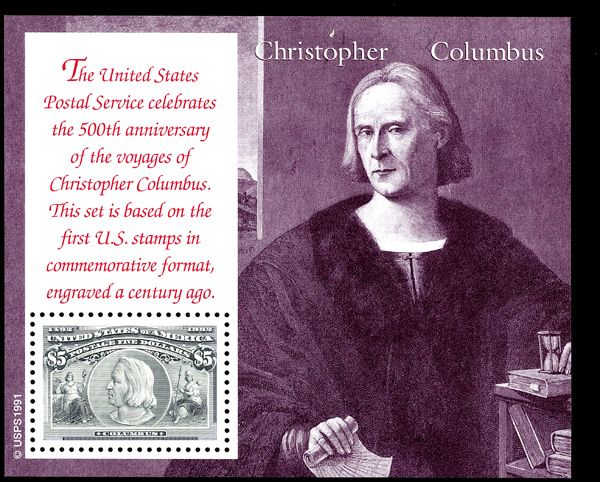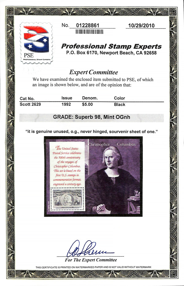 7535 nh 2629 image1992, Voyages of Columbus, souvenir sheet of 1, "Christopher Columbus" (Scott 2629), o.g., never hinged, Superb no SMQ price, with 2010 P.S.E. certificate graded SUP 98. (Image) (Image2) (All Images)
