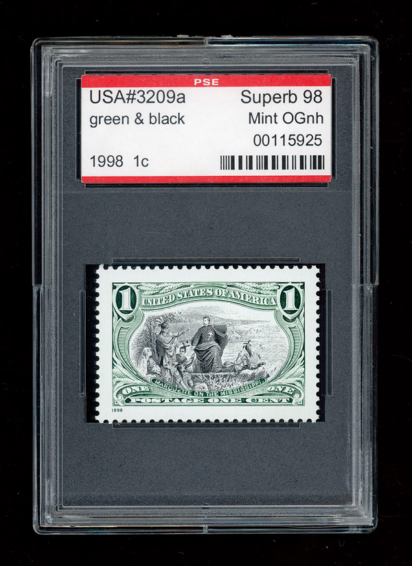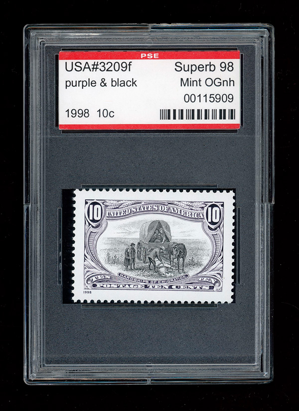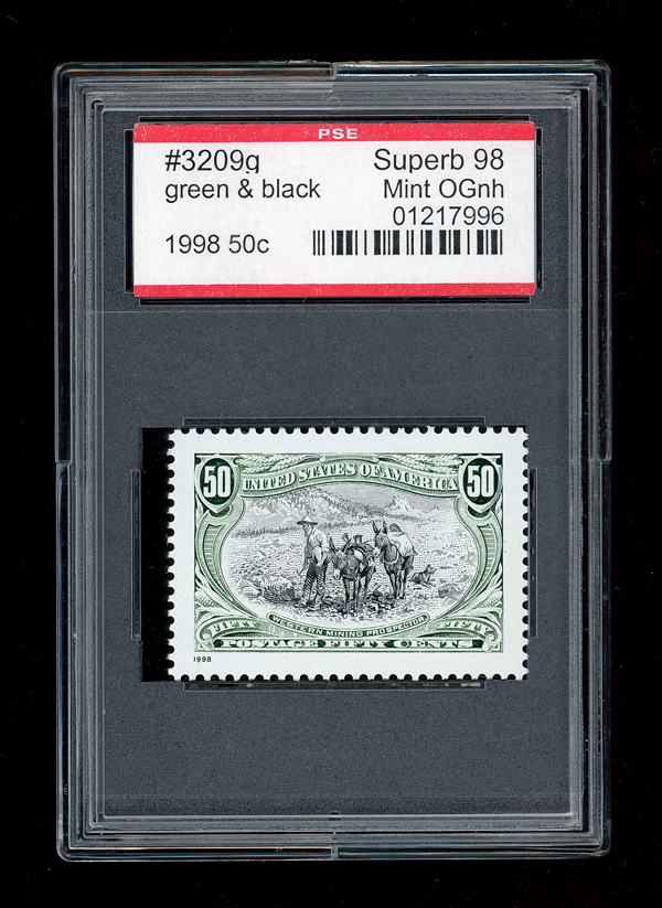 7543 nh 3209g image1998, 50¢ Trans-Mississippi, single from souvenir sheet (Scott 3209g), o.g., never hinged, Superb no SMQ price, with P.S.E. encapsulated certificate graded SUP 98. (Image) Suggested Bid $100