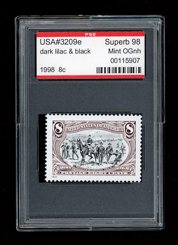 7541 nh 3209e image1998, 8¢ Trans-Mississippi, single from souvenir sheet (Scott 3209e), o.g., never hinged, Superb no SMQ price, with P.S.E. encapsulated certificate graded SUP 98. (Image) Suggested Bid $100