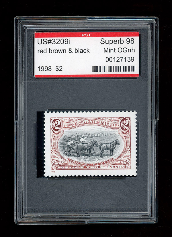 7545 nh 3209i image1998, $2 Trans-Mississippi, single from souvenir sheet (Scott 3209i), o.g., never hinged, Superb no SMQ price, with P.S.E. encapsulated certificate graded SUP 98. (Image) Suggested Bid $100
