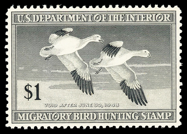 7681 nh RW14 imageFederal Duck Stamp, 1947, $1 Snow Geese (Scott RW14), o.g., never hinged, Extremely Fine.