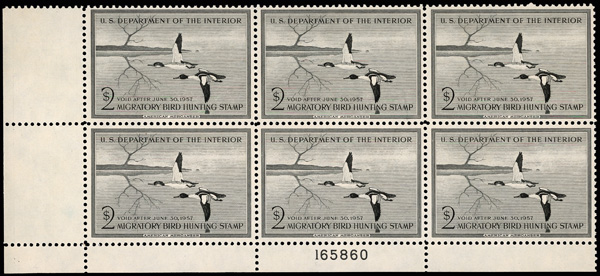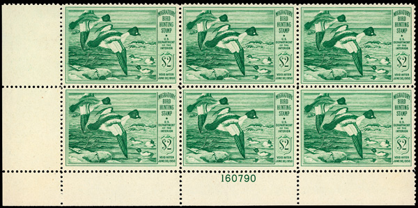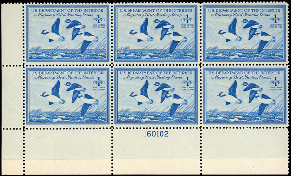 7684 nhbl RW15 imageFederal Duck Stamp, 1948, $1 Buffleheads (Scott RW15), bottom left plate block of 6 with plate number 160102, Fresh, well-centered appearance, o.g., never hinged, Very Fine to Extremely Fine.
