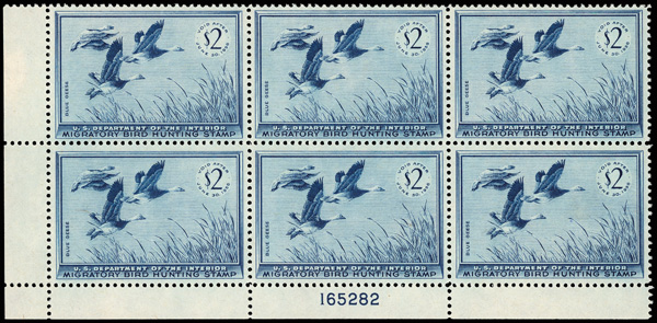 7697 nhbl RW22 imageFederal Duck Stamp, 1955, $2 Blue Geese (Scott RW22), bottom left plate block of 6 with plate number 165282, Clean centering, fresh color, o.g., never hinged, Very Fine.
