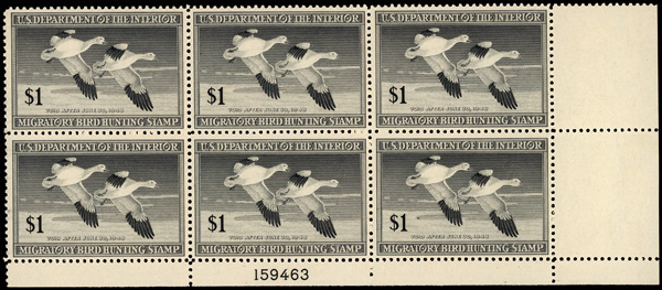 7682 nhbl RW14 imageFederal Duck Stamp, 1947, $1 Snow Geese (Scott RW14), bottom right plate block of 6 with plate number 159463, Centered design, fresh color, o.g., never hinged, Very Fine.