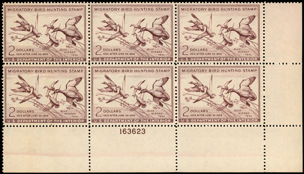 7693 nhbl RW20 imageFederal Duck Stamp, 1953, $2 Blue-winged Teals (Scott RW20), bottom right plate block of 6 with plate number 163623, Fresh surface, centered design, o.g., never hinged, Very Fine.