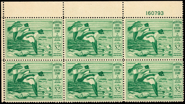 7686 nhbl RW16 imageFederal Duck Stamp, 1949, $2 Goldeneye Ducks (Scott RW16), block of 6 with plate number 160793 at top, Bright margins, fresh paper, o.g., never hinged; small tear on plate number selvage, Fine.