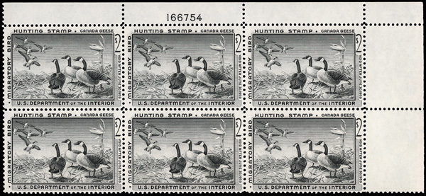 7703 nhbl RW25 imageFederal Duck Stamp, 1958, $2 Canada Geese (Scott RW25), top right plate block of 6 with plate number 166754, Even borders, fresh surface, o.g., never hinged, Very Fine.