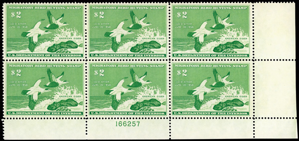 7701 nhbl RW24 imageFederal Duck Stamp, 1957, $2 American Eider (Scott RW24), bottom right plate block of 6 with plate number 166257, Fresh color, nicely centered design, o.g., never hinged, Very Fine.