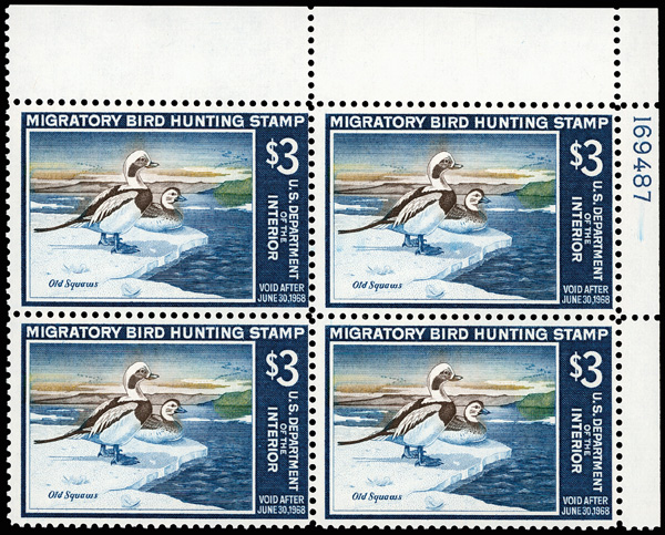 7716 nhbl RW34 imageFederal Duck Stamp, 1967, $3 Old Squaw Ducks (Scott RW34), top right plate block of 4 with plate number 169487, Fresh appearance, clean borders, o.g., never hinged, Fine.