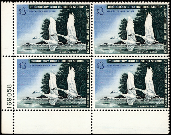 7714 nhbl RW33 imageFederal Duck Stamp, 1966, $3 Whistling Swans (Scott RW33), bottom left plate block of 4 with plate number 169058, Even centering, bright paper, o.g., never hinged, Fine to Very Fine.