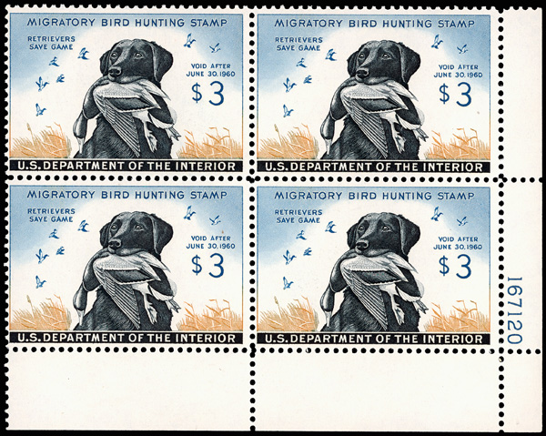 7705 nhbl RW26 imageFederal Duck Stamp, 1959, $3 Labrador Retriever (Scott RW26), bottom right plate block of 4 with plate number 167120, Fresh, well-defined margins, o.g., never hinged, Fine to Very Fine.
