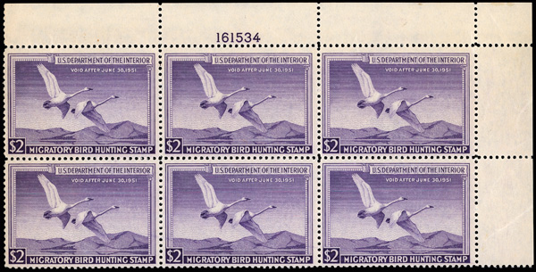 7688 nhbl RW17 imageFederal Duck Stamp, 1950, $2 Trumpeter Swans (Scott RW17), top right plate block of 6 with plate number 161534, Fresh color, neat margins, o.g., never hinged, Very Fine.