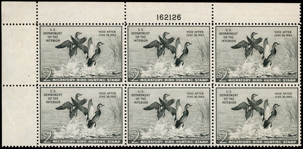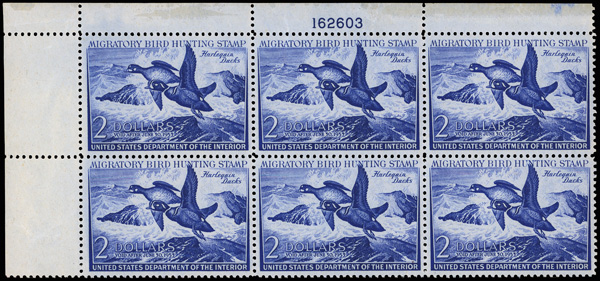 7692 nhbl RW19 imageFederal Duck Stamp, 1952, $2 Harlequin Ducks (Scott RW19), top left plate block of 6 with plate number 162603, Bright color, even centering, o.g., never hinged; gum skips on right two stamps, Very Fine to Extremely Fine.