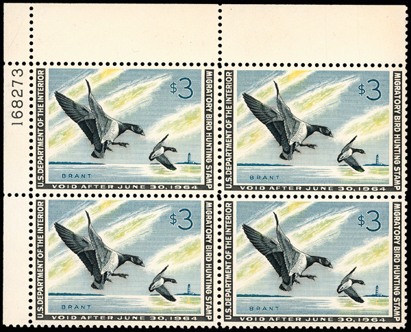 7710 nhbl RW30 imageFederal Duck Stamp, 1963, $3 Brants (Scott RW30), top left plate block of 4 with plate number 168273, Bright, fresh layout, o.g., never hinged, Very Fine.