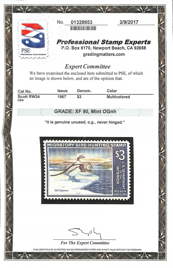 7715 nh RW34 imageFederal Duck Stamp, 1967, $3 Old Squaw Ducks (Scott RW34), o.g., never hinged, Extremely Fine, with 2017 P.S.E. certificate graded XF 90.