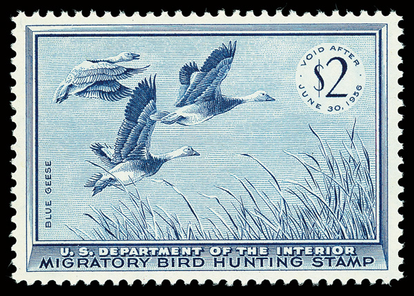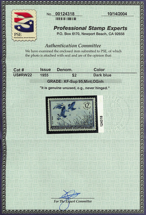 7696 nh RW22 imageFederal Duck Stamp, 1955, $2 Blue Geese (Scott RW22), o.g., never hinged, Extremely Fine to Superb, with 2004 P.S.E. certificate graded XF-SUP 95.