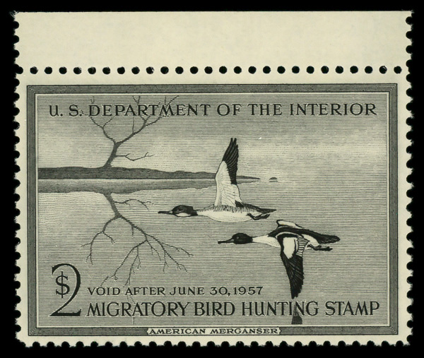 7698 nh RW23 imageFederal Duck Stamp, 1956, $2 American Merganser (Scott RW23), o.g., never hinged, Very Fine.