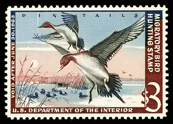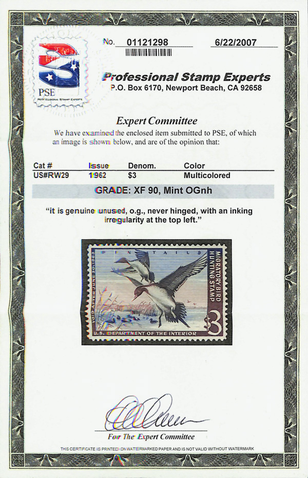 7708 nh RW29 imageFederal Duck Stamp, 1962, $3 Pintail Drakes (Scott RW29), o.g., never hinged, Extremely Fine, with 2007 P.S.E. certificate graded XF 90.