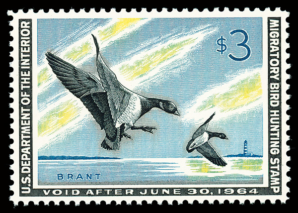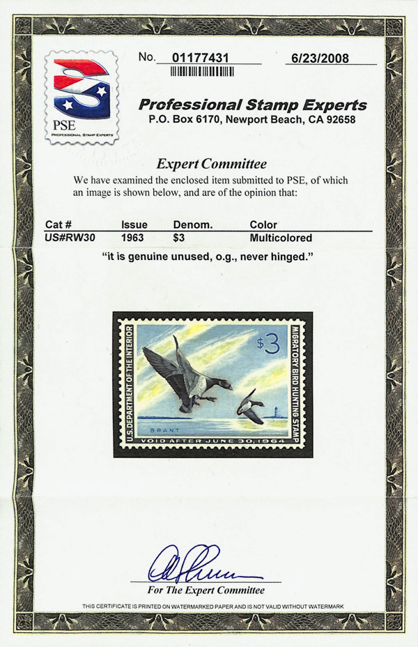 7709 nh RW30 imageFederal Duck Stamp, 1963, $3 Brants (Scott RW30), o.g., never hinged, Extremely Fine, with 2008 P.S.E. certificate.