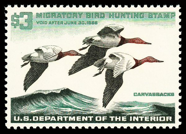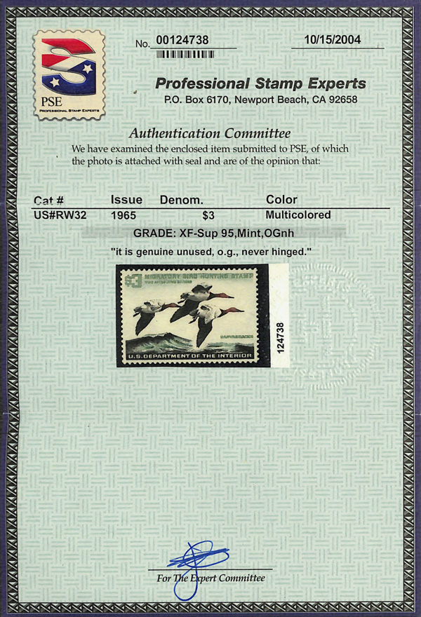 7712 nh RW32 imageFederal Duck Stamp, 1965, $3 Canvasback Drakes (Scott RW32), o.g., never hinged, Extremely Fine to Superb, with 2004 P.S.E. certificate graded XF-SUP 95.