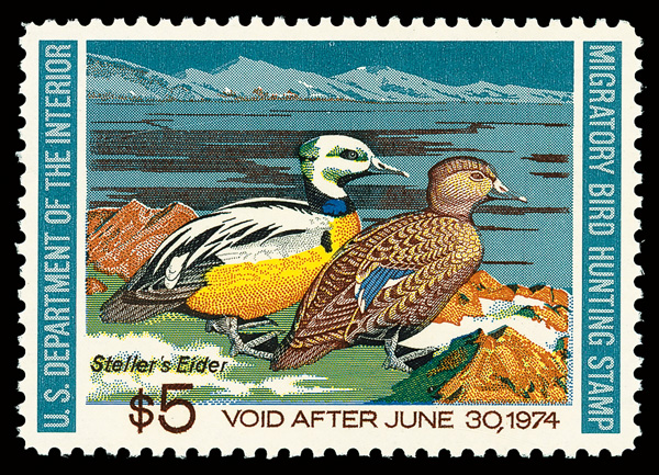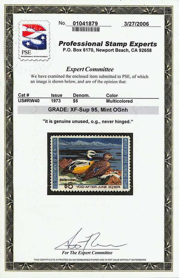 7720 nh RW40 imageFederal Duck Stamp, 1973, $5 Steller's Eiders (Scott RW40), o.g., never hinged, Extremely Fine to Superb, with 2006 P.S.E. certificate graded XF-SUP 95.