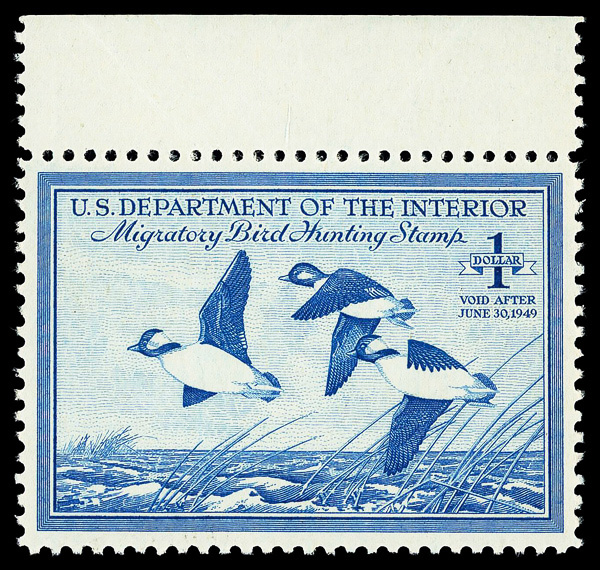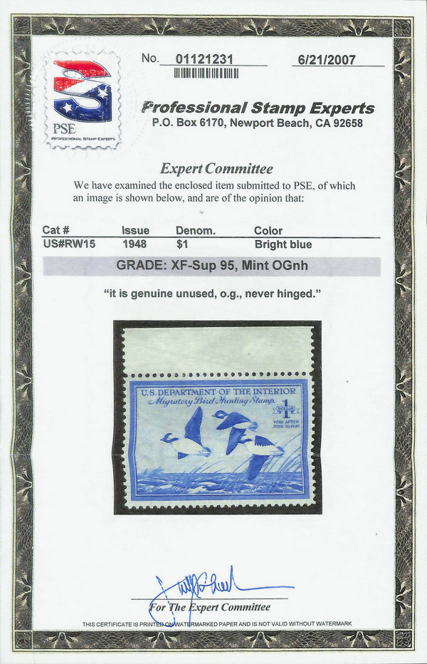 7683 nh RW15 imageFederal Duck Stamp, 1948, $1 Buffleheads (Scott RW15), o.g., never hinged, Extremely Fine to Superb, with 2007 P.S.E. certificate graded XF-SUP 95.