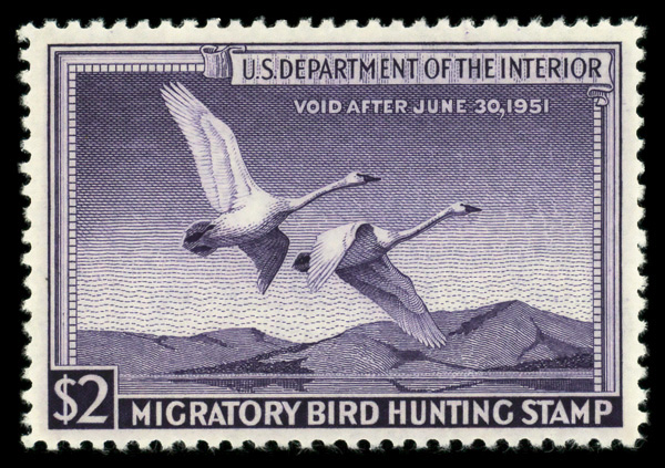 7687 nh RW17 imageFederal Duck Stamp, 1950, $2 Trumpeter Swans (Scott RW17), o.g., never hinged, Very Fine to Extremely Fine.