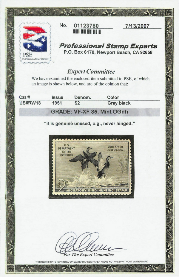 7689 nh RW18 imageFederal Duck Stamp, 1951, $2 Gadwall Ducks (Scott RW18), o.g., never hinged, Very Fine to Extremely Fine, with 2007 P.S.E. certificate graded VF-XF 85.