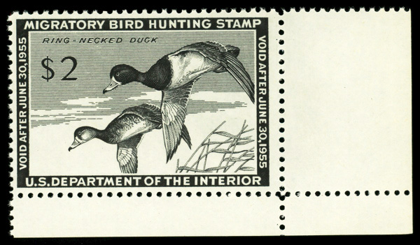 7694 nh RW21 imageFederal Duck Stamp, 1954, $2 Ring-necked Ducks (Scott RW21), corner margin single, o.g., never hinged, Very Fine.