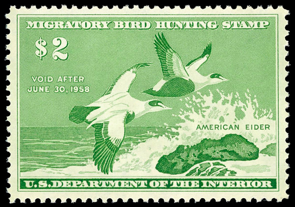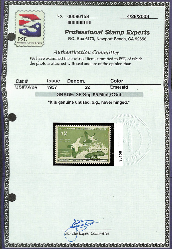 7700 nh RW24 imageFederal Duck Stamp, 1957, $2 American Eider (Scott RW24), o.g., never hinged, Extremely Fine to Superb, with 2003 P.S.E. certificate graded XF-SUP 95.