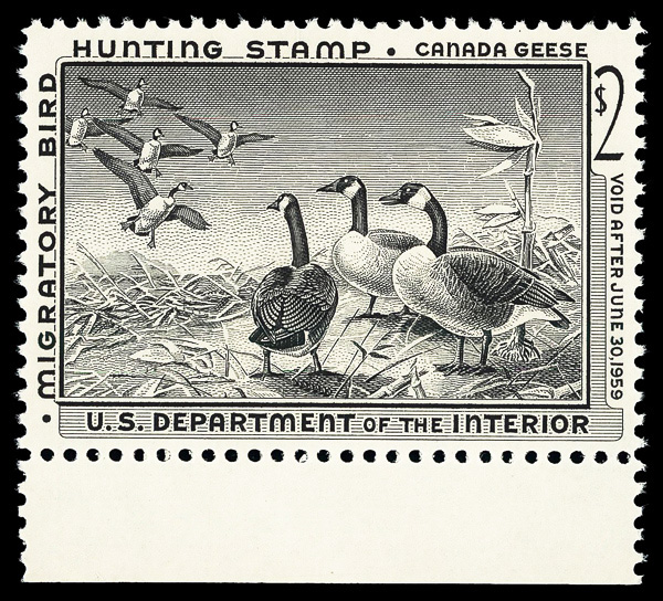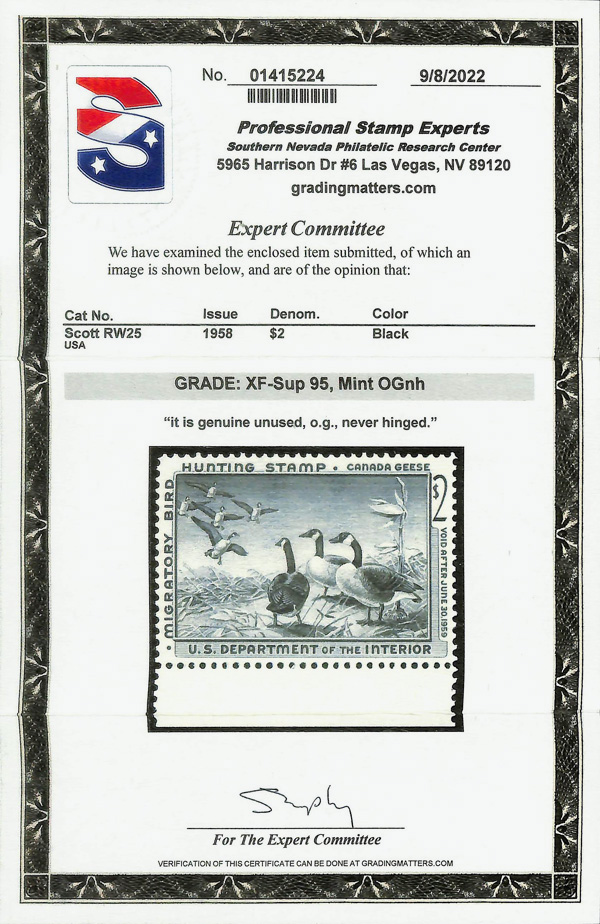 7702 nh RW25 imageFederal Duck Stamp, 1958, $2 Canada Geese (Scott RW25), o.g., never hinged, Extremely Fine to Superb, with 2022 P.S.E. certificate graded XF-SUP 95.