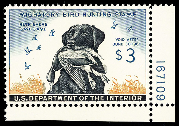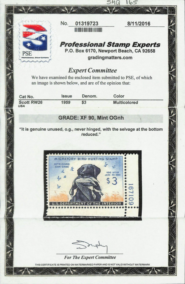 7704 nh RW26 imageFederal Duck Stamp, 1959, $3 Labrador Retriever (Scott RW26), plate number single, o.g., never hinged, Extremely Fine, with 2016 P.S.E. certificate graded XF 90.