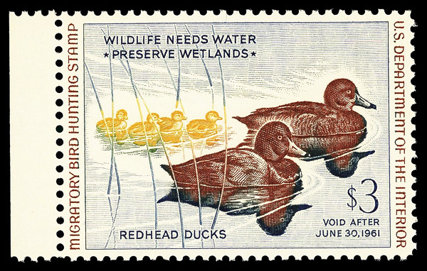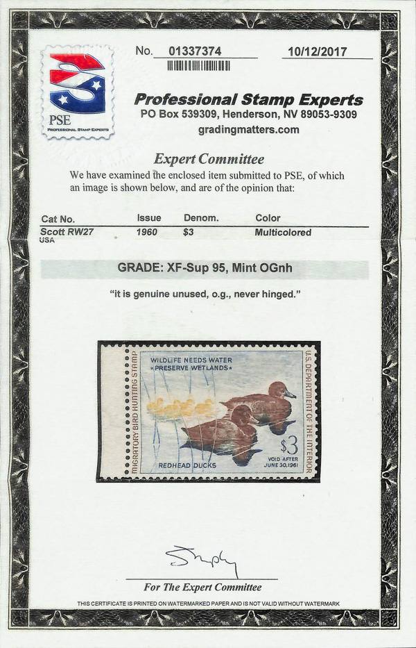 7706 nh RW27 imageFederal Duck Stamp, 1960, $3 Redhead Ducks (Scott RW27), o.g., never hinged, Extremely Fine to Superb, with 2017 P.S.E. certificate graded XF-SUP 95.