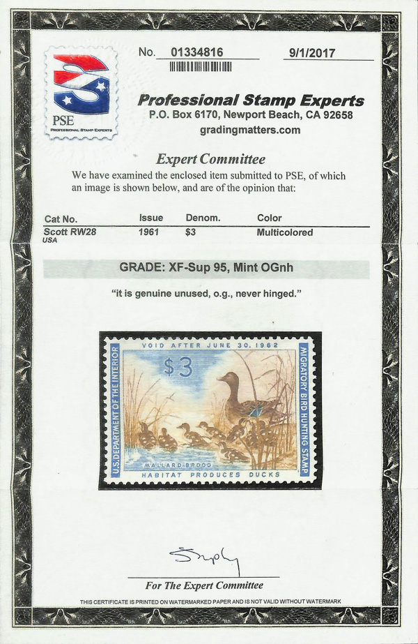 7707 nh RW28 imageFederal Duck Stamp, 1961, $3 Mallards (Scott RW28), o.g., never hinged, Extremely Fine to Superb, with 2017 P.S.E. certificate graded XF-SUP 95.