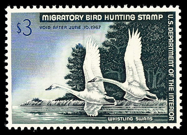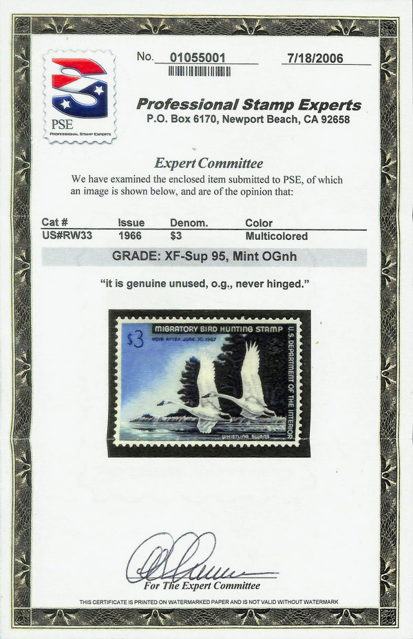 7713 nh RW33 imageFederal Duck Stamp, 1966, $3 Whistling Swans (Scott RW33), o.g., never hinged, Extremely Fine to Superb, with 2006 P.S.E. certificate graded XF-SUP 95.