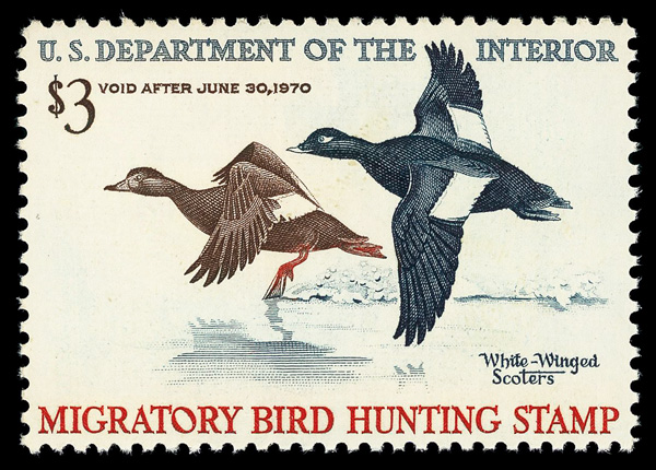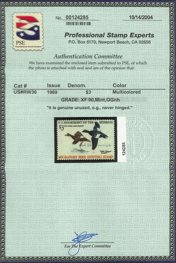 7717 nh RW36 imageFederal Duck Stamp, 1969, $3 White-Winged Scoters (Scott RW36), o.g., never hinged, Extremely Fine, with 2004 P.S.E. certificate graded XF 90.