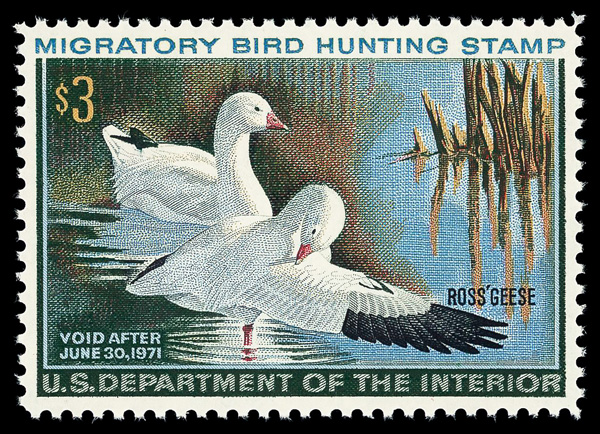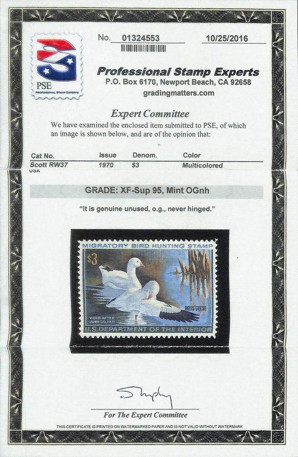 7718 nh RW37 imageFederal Duck Stamp, 1970, $3 Ross's Geese (Scott RW37), o.g., never hinged, Extremely Fine to Superb, with 2016 P.S.E. certificate graded XF-SUP 95.