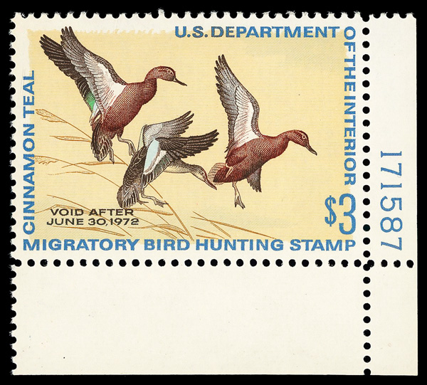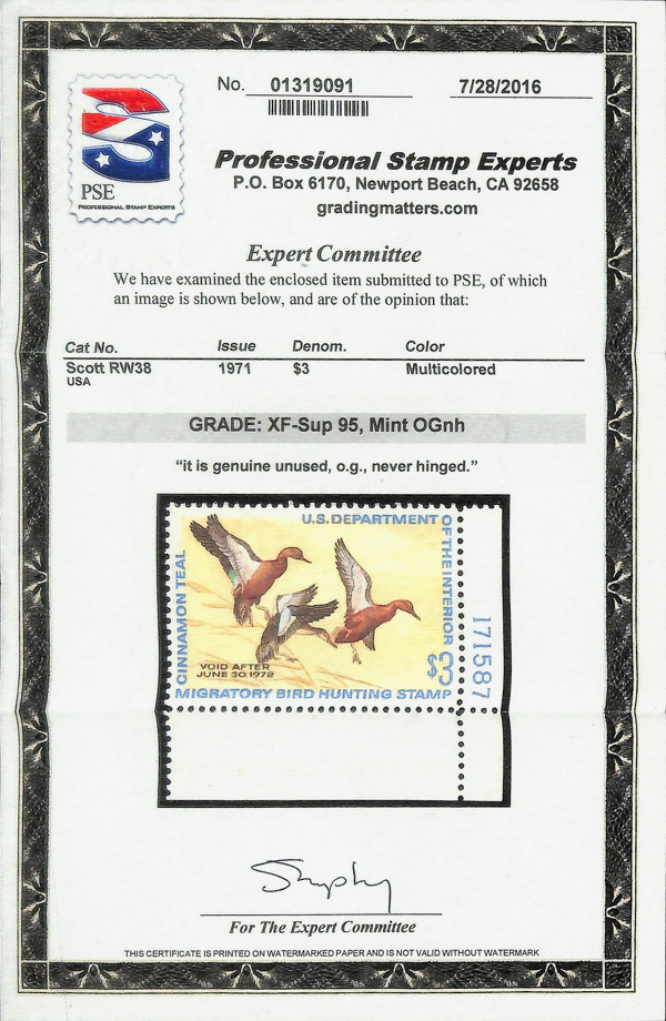 7719 nh RW38 imageFederal Duck Stamp, 1971, $3 Cinnamon Teals (Scott RW38), plate number single, o.g., never hinged, Extremely Fine to Superb, with 2016 P.S.E. certificate graded XF-SUP 95.
