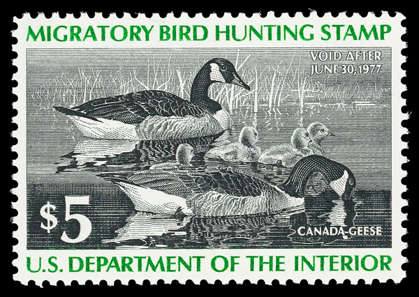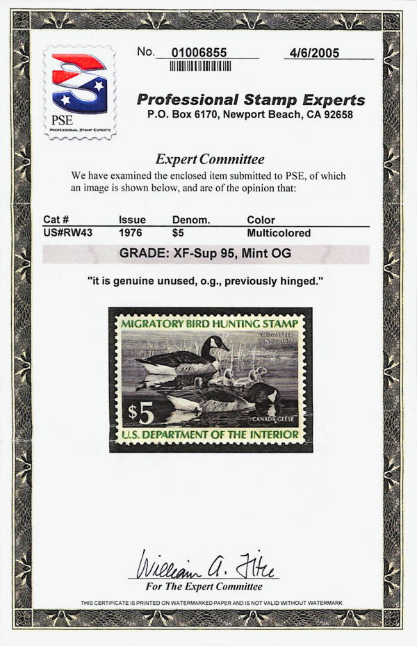7721 og RW43 imageFederal Duck Stamp, 1976, $5 Canada Geese (Scott RW43), o.g., lightly hinged, Extremely Fine to Superb, with 2005 P.S.E. certificate graded XF-SUP 95. (Image) (Image2) (All Images)