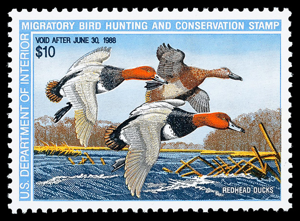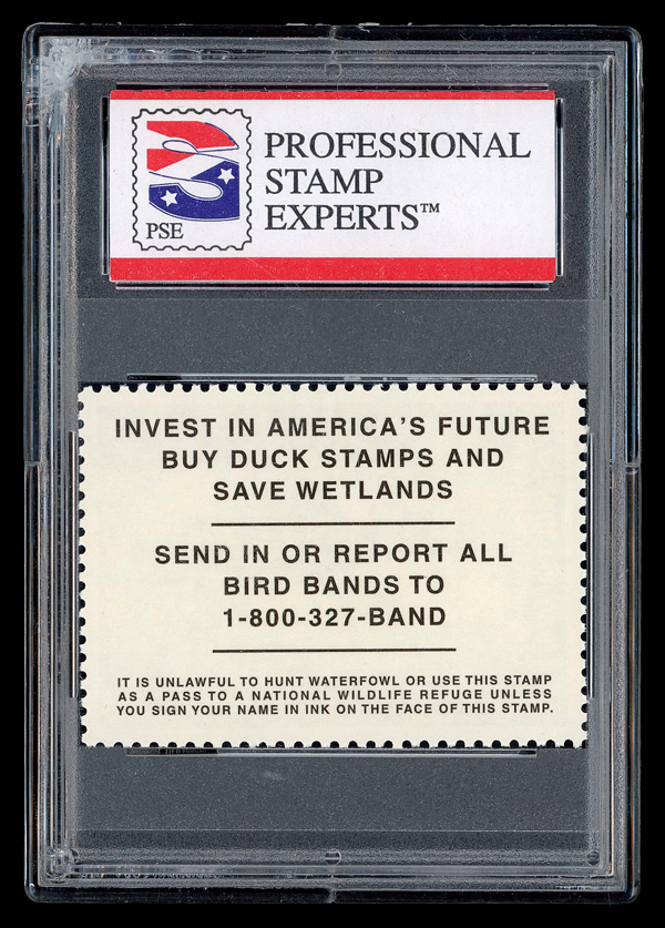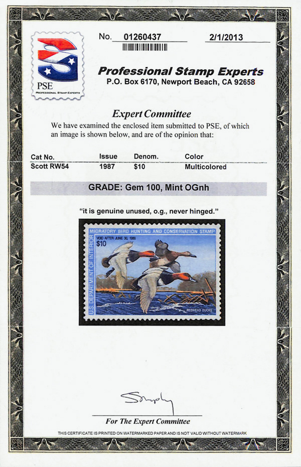 7725 nh RW54 imageFederal Duck Stamp, 1987, $10 Redhead Ducks (Scott RW54), o.g., never hinged, Superb, with 2013 P.S.E. certificate graded GEM 100.