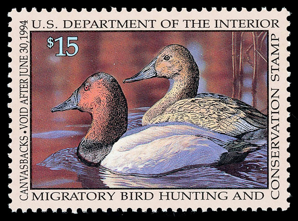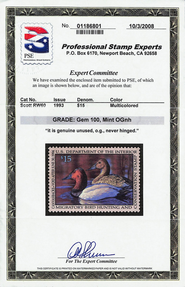 7731 nh RW60 imageFederal Duck Stamp, 1993, $15 Canvasbacks (Scott RW60), o.g., never hinged, Superb, with 2008 P.S.E. certificate graded GEM 100.