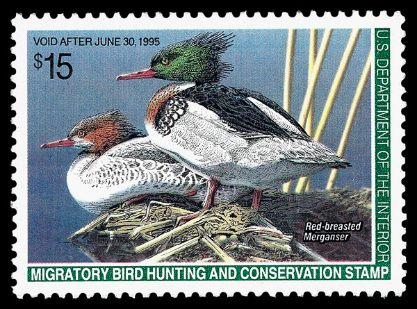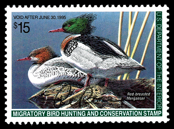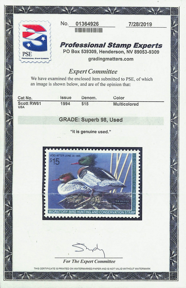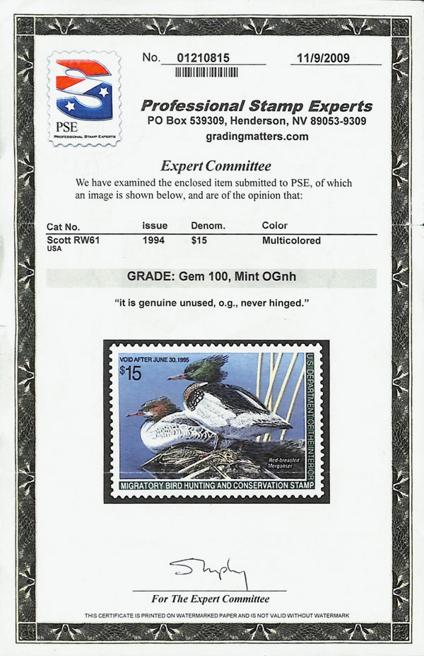 7732 nh RW61 imageFederal Duck Stamp, 1994, $15 Mergansers (Scott RW61), o.g., never hinged, Superb, with 2009 P.S.E. certificate graded GEM 100.